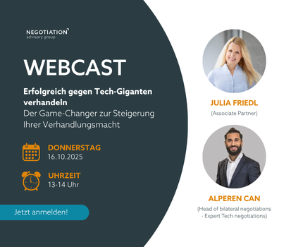 Verhandlungen mit großen Software-Anbietern wie SAP, Microsoft oder Salesforce gehören zu den strategisch wichtigsten Themen Ihres Unternehmens – und gleichzeitig fühlen sich viele Unternehmen oft machtlos. In unserem kostenfreien Webcast am 16. Oktober 2025 zeigen Julia Friedl und Alperen Can, wie Sie auch in diesen komplexen Verhandlungen die Kontrolle übernehmen und Ihre Verhandlungsmacht erheblich steigern können. Tech-Giganten… NAG Webcast: Erfolgreich gegen Tech-Giganten verhandeln weiterlesen